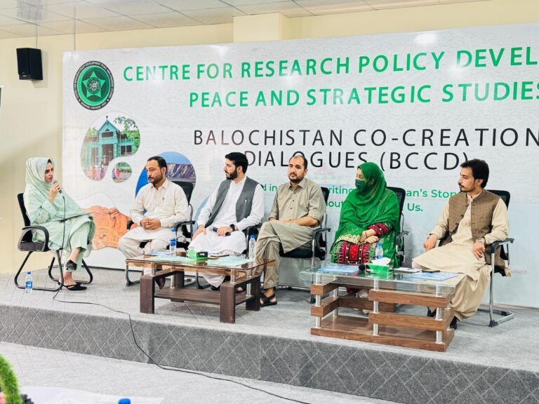 Balochistan, Pakistan’s largest province by area, is a region of immense geopolitical significance, rich natural resources, and diverse cultural heritage. However, it faces persistent challenges related to governance, economic underdevelopment, security, and political alienation. To address these issues through inclusive dialogue, the Centre for Research, Policy Development, Peace & Strategic Studies initiated ” Balochistan Co-Creation Dialogues (BCCD)”—a high-level policy and peace roundtable designed to foster multi-stakeholder engagement, generate actionable policy recommendations, and promote sustainable peace in Balochistan.